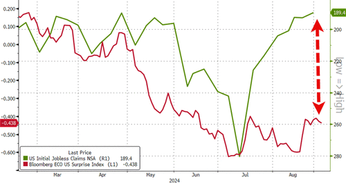 Initial jobless claims continues to ignore the 'other crappy data', printing 227k (in line with 230k exp) and basically unchanged at two-month lows...