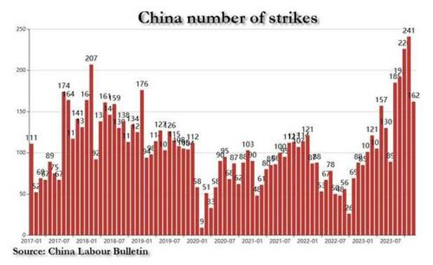 Most importantly, as we noted previously, the lack of stimulus (amid China's real estate sector crisis and escalating tensions with Washington on trade) has had a very adverse impact on both economic and market sentiment at a time when China's middle class is growing increasingly restless and pitchforky, resulting in a surge in labor strikes and (mostly peaceful) protests.