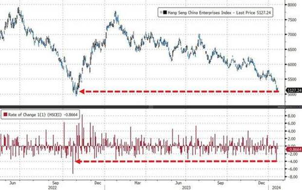 The Hang Seng China Enterprises Index crashed 6.5% this week - its worst weekly loss since March 2023 with Wednesday seeing the biggest daily loss since Oct 2022 as the index plummeted to key support levels around the Oct 2022 lows.