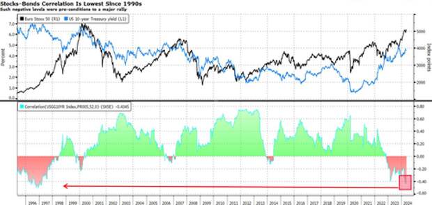 Whatever the print, the impact that the figure may have on bond yields is looking increasingly important as the correlation between European equities and US treasury yields is now the most negative since the mid-1990s, a pre-condition to a major rally back then.