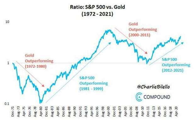 Just take a look at the chart below. It shows the ratio of S&P 500 performance vs gold through 2021.