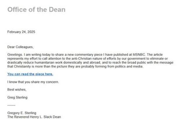 A Yale University dean emailed the entire Divinity School a copy of his MSNBC essay criticizing President Donald Trump, according to an email recently obtained by The College Fix.