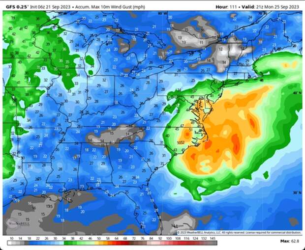 From the Carolinas to Washington–Baltimore metro area to New York City, gusts of 40 mph, with some areas exceeding 50 mph near the coastline, could be seen.
