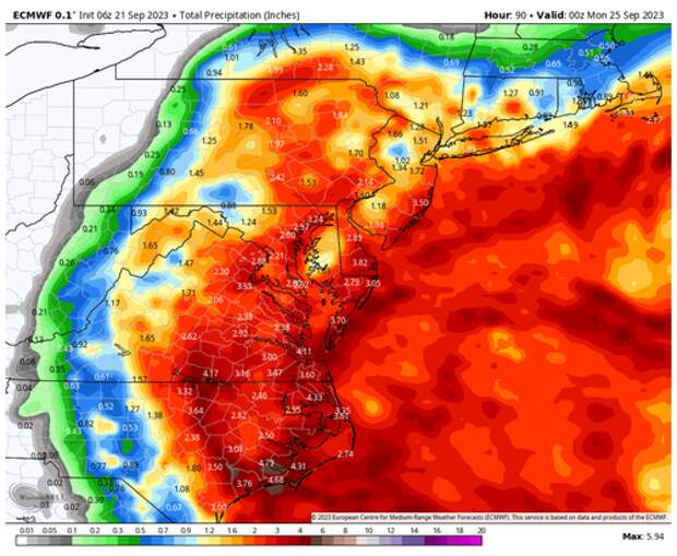 Heavy rainfall is expected for major US East Coast cities. Some areas see 2 to 4 inches of rain - or about a month's rainfall.
