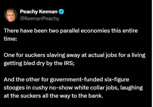 The level of the theft has now to be dawning on everyone not living off the public purse which is, what, 60%, 70% of us? The anger setting in is soul-deep, and very very powerful. People who live straightened lives, the poorly pensioned, those living off the laughable social security stipend, those waiting for health care, those whose children can’t even dream of an education, of college, of a six-figure salary which is now subsistence in the ruined cities. Those facing cancer treatment because of the vaccine, and don’t have excess funds. Their families, despairing, hurting, broke.