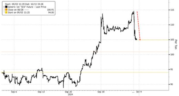 Iron ore futures jumped nearly 29% from the lows of around $90 a ton beginning in late September on optimism that Beijing would boost the economy and oversupply conditions in China's steel industry would dissipate. However, when NDRC did not deliver additional stimulus today, iron ore went into meltdown mode, plunging 5% to the $105 level. Iron ore is a key ingredient for steelmaking, which has suffered amid a multi-year property crisis in the world's second-largest economy.