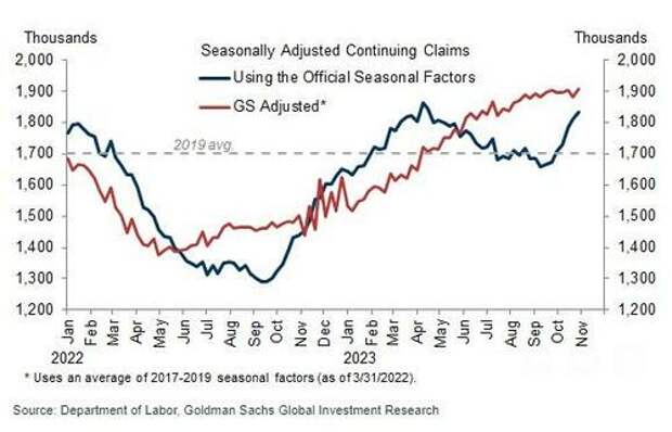 And it's going to get worse, as Goldman reminds us that ongoing seasonal distortions have increasingly weighed on the level of continuing claims over the last six months, and we now expect that the reversal of those distortions could exert a cumulative boost of 375k to the level of continuing claims between now and March.