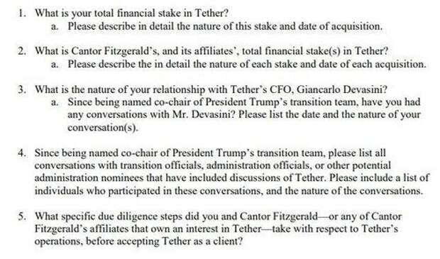 “While you have agreed to divest your interest in Cantor Fitzgerald, which holds a 5% stake in Tether, and serves as Tether’s asset manager, this divestment does not end the questions about your deep personal ties to the company or its affiliates,” wrote Warren, the top Democrat on the Senate Banking Committee.