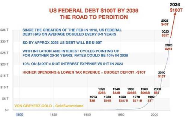 So, extrapolating the current debt explosion, which is exponential, will give the US a federal debt of $100 trillion in 2036; see the graph below.