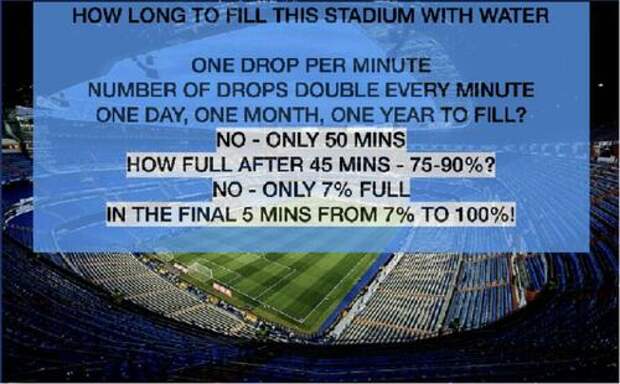 Somebody commented that how long it takes depends on the size of the stadium. This obviously makes no material difference since the amount of water doubles every minute.