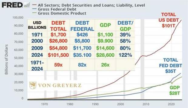 A $100 trillion debt means both high inflation and a high risk of default, leading to much higher rates. No one will hold risky debt with a mere 3-4% yield.