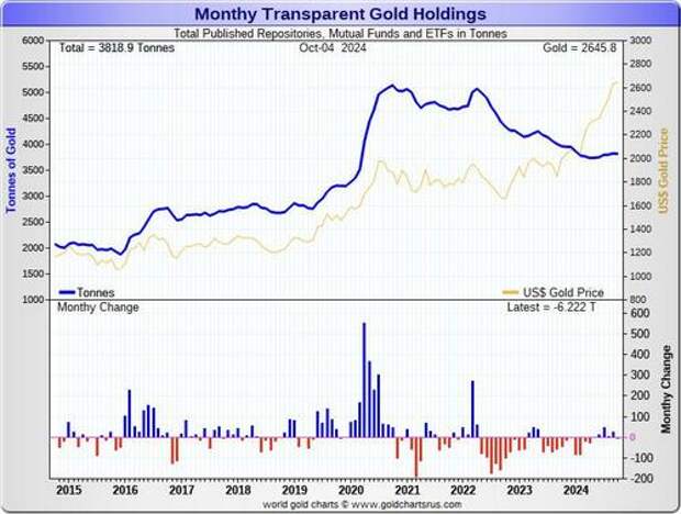 Today, these funds and ETFs hold just over 3,800 tonnes of gold – 25% less than in 2020 – and the gold price has gone from $1,900 to $2,600, which is up 37%!