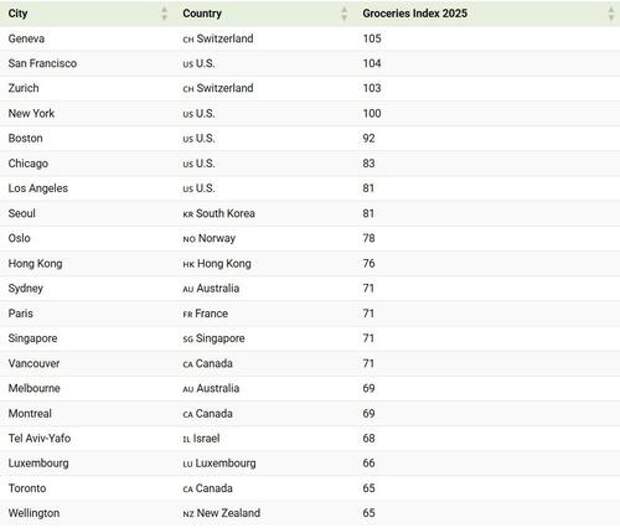 Below, we show the grocery price index in 2025, reflecting the average cost of groceries in U.S. dollars using New York City as a benchmark: