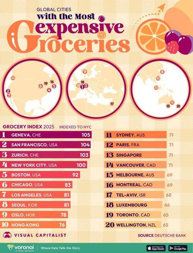 But where in the world do customers face the highest prices overall?This graphic, via Visual Capitalist's Dorothy Neufeld, shows the cities with the most expensive grocery prices, based on data from Deutsche Bank.