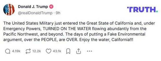 “The United States Military just entered the Great State of California and, under Emergency Powers, TURNED ON THE WATER flowing abundantly from the Pacific Northwest, and beyond,” Trump announced on Truth Social.