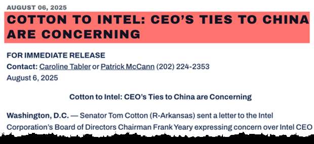 President Trump must have read U.S. Republican Senator Tom Cotton's letter, sent to Intel's Board on Wednesday, about the chipmaker's new CEO, Lip-Bu Tan's ties to Chinese firms, and a recent criminal case involving his former company, Cadence Design.
