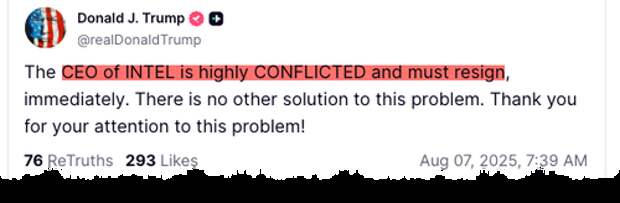 That's because Trump just fired off a shocking new Truth Social post moments ago."The CEO of INTEL is highly CONFLICTED and must resign, immediately," Trump wrote on his social media platform.