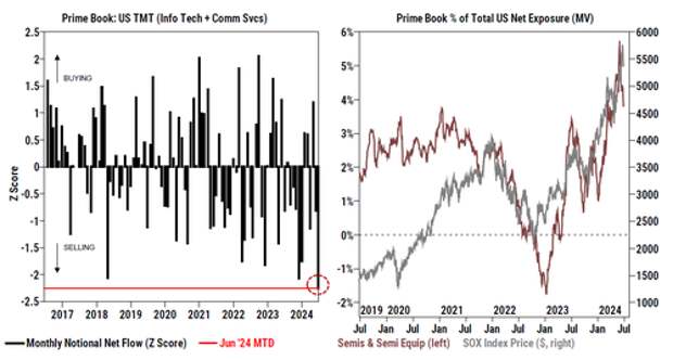 In another sign of investor concern about market concentration, we first reported that hedge funds “aggressively” sold tech stocks in June - the month in which Nvidia briefly became the world’s largest company - to retail investors. Semiconductor and semiconductor equipment stocks were the ones offloaded the most, according an analysis by Goldman Sachs Group Inc.