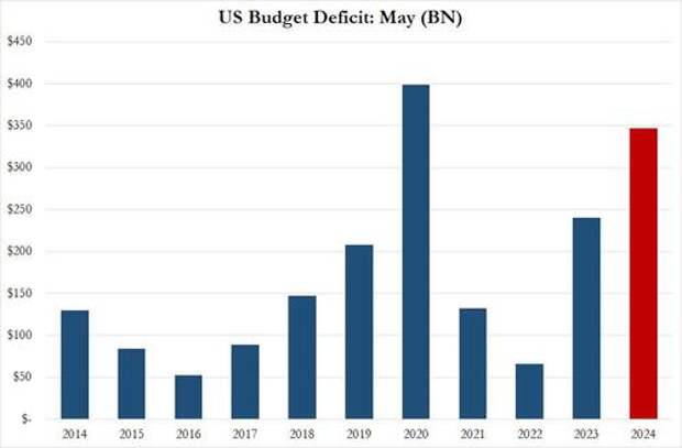 ..... resulting in a May budget deficit of $347 billion - about $100 billion more than consensus expected - and the second biggest May deficit on record, with only the Covid crisis peak of May 2020 higher.