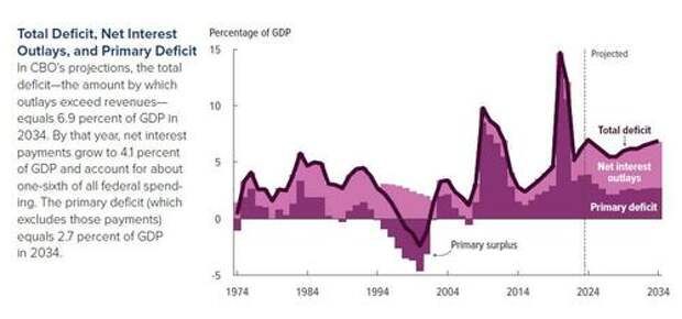 As interest costs and spending on programs like Medicare and Social Security continue to rise, the CBO projects federal outlays will reach 24.2% of gross domestic product (GDP) in 2024 and 24.9% of GDP in 2034.