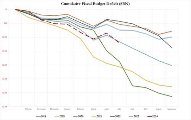 As a result of the blowout May deficit, the cumulative fiscal 2024 shortfall once again surpassed the 2023 total, bringing the YTD deficit total to just over $1.2 trillion more than the $1.16 trillion cumulative deficit througth May 2023, and that's with 4 more months left in the fiscal year.