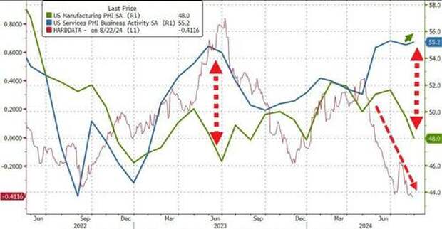 S&P Global's Flash PMI data for August signals the continued divergence between US manufacturing (slump) and Services (survive).