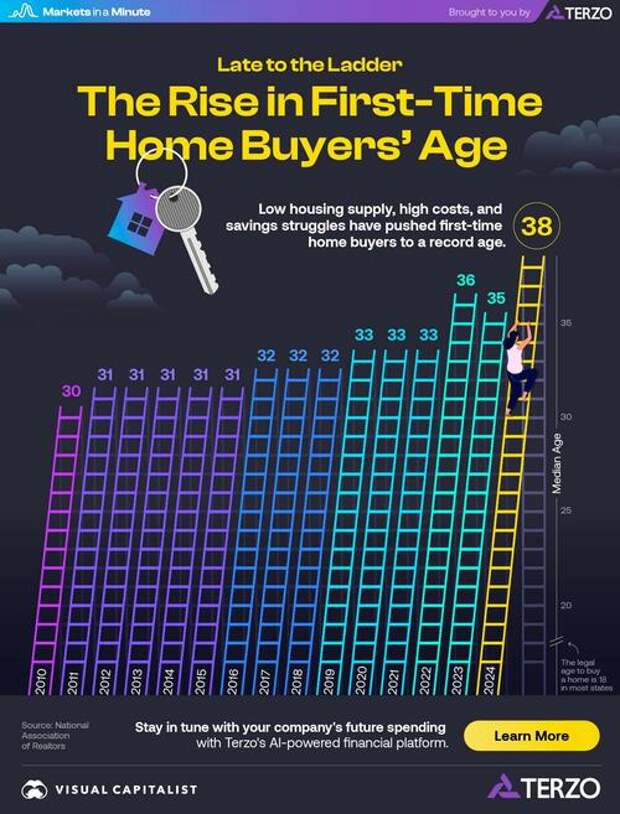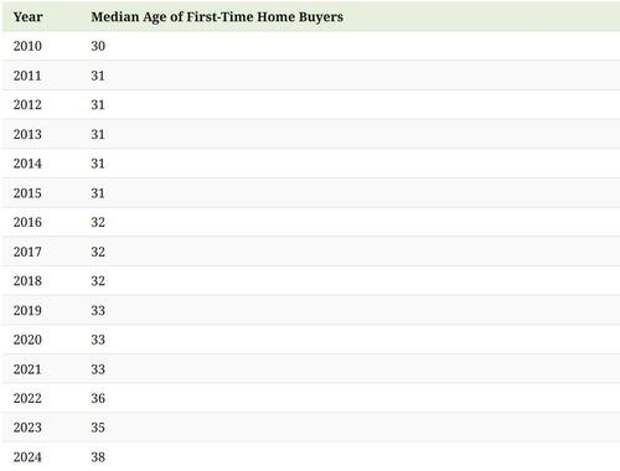 By 2024, people buying homes are much older, hitting a record of 38. The share of first-time home buyers on the market also dropped from 32% to 24%.