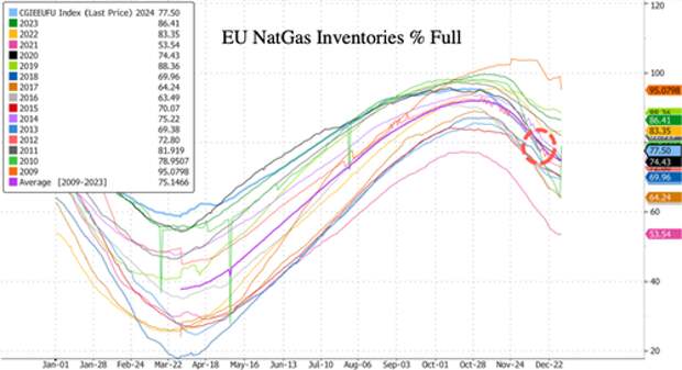 Meanwhile, Europe's gas inventories are falling in line with a 15-year average this winter (read here). The halt next month could accelerate the drawdown in supplies across the continent, with a Goldman analyst forecasting storage levels dropping to 39% by the end of the heating season—well below this year's 53% mark.