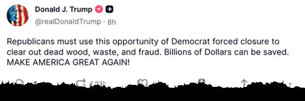 Late last night, Trump wrote on Truth Social, "Republicans must use this opportunity of Democrat forced closure to clear out dead wood, waste, and fraud. Billions of Dollars can be saved."