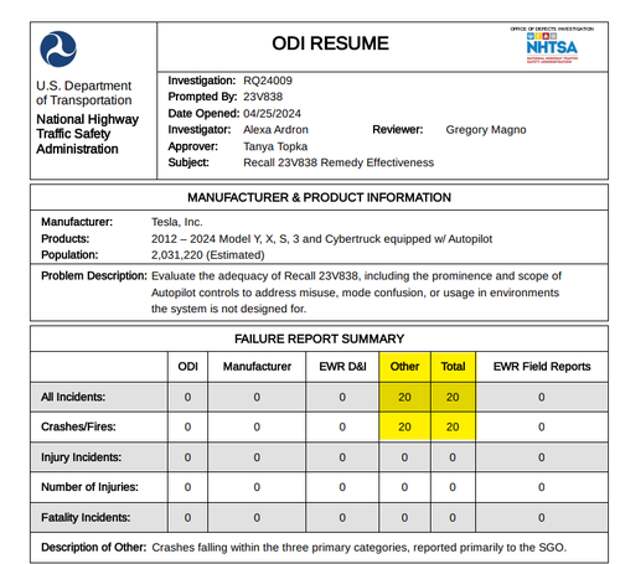 The federal agency is concerned about whether the company's remedy was enough, partly because 20 crashes have occurred since the over-the-air software update earlier this year.