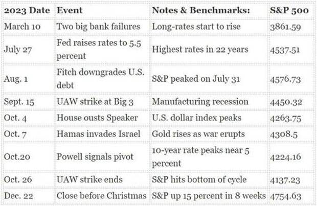 Also, we can look at all the positives in line for 2024 and forget that the Trickster will unveil several surprises. After all, we had several shocks in 2023 that interrupted an otherwise positive year—starting with the banking crisis in March, then the credit downgrade in July and the invasion of Israel in October.