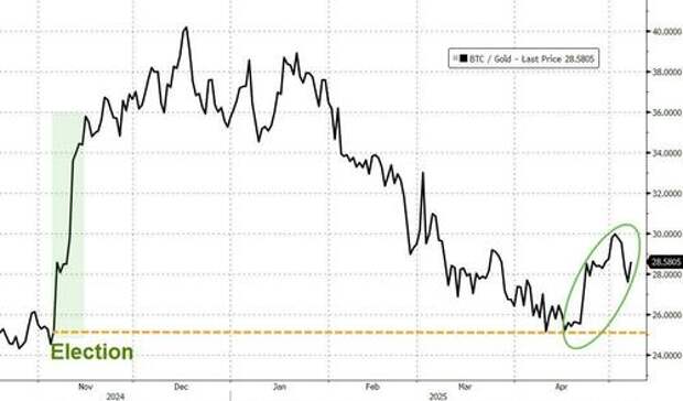 The relationship has been very cyclical since the election when 'digital gold' dramatically outperformance the barbarous relic. But from the start of February, gold has outperformed bitcoin.. until erasing all of the outperformance and prompting a relative recovery for crypto...