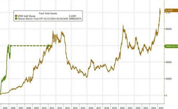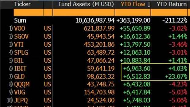 However, despite this dramatic divergence, the performance chasm has failed to deter investors putting new money to work as inflows into IBIT (BlackRock's spot bitcoin ETF) have surpassed inflows into GLD (SPDR Gold Trust ETF).