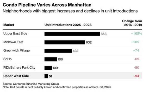 Only 51 new condo units are expected to be completed in the neighborhood through 2028, according to Corcoran Sunshine Marketing Group — a 94% drop from the 869 units added between 2016 and 2019.