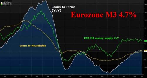 However, a potential red flag emerged in the latest monetary aggregate data out of the Eurozone, where M3 growth dipped from 4.9% to 4.7%, below the 4.9% expected, despite the ECB continuing its monetary blast at record levels, not to mention last week's massive TLTRO.