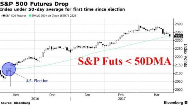 U.S. equity index futures suggested stocks would retreat for the seventh time in eight days, with S&P futures sliding below the 50 DMA for the first time since the election.