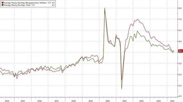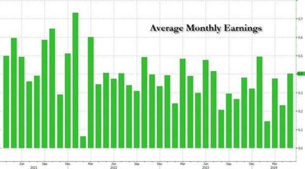 It wasn't just the jobs that came in red hot: wages did too: in May, average hourly earnings increased by 14 cents, or 0.4 percent, to $34.91, double the April increase of 0.