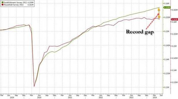... which means that the gap between the always upward sloping (and market moving) Establishment Survey and the flatlined Household Survey, which hasnt made a new high since late 2023 and is back to where it was last summer, is now the biggest on record!