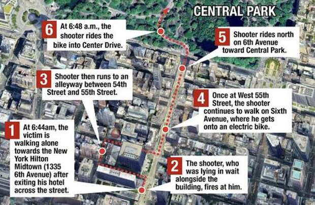 The suspect shot the 50-year-old Thompson -- who was arriving at the New York Hilton Midtown for an investors' meeting at 6:45 am -- in the back and leg before leaving first by foot, then using an e-bike that he rode through Central Park. Police think he exited the park at West 77th Street -- minus the backpack he wore during the killing and as he rolled into the park.