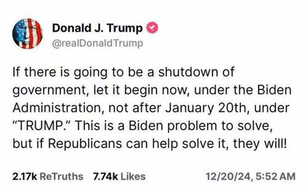 President-elect Trump chimed in on Friday as well, posting on Truth Social: "If there is goign to be a shutdown of government, let it begin now, under the Biden Administration, not after January 20th, under TRUMP."