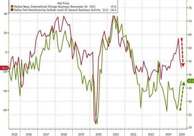 On the not so bright side, The Dallas Fed Manufacturing PMI survey tumbled to -16.3 (well below expectations) - the lowest since July 2024.
