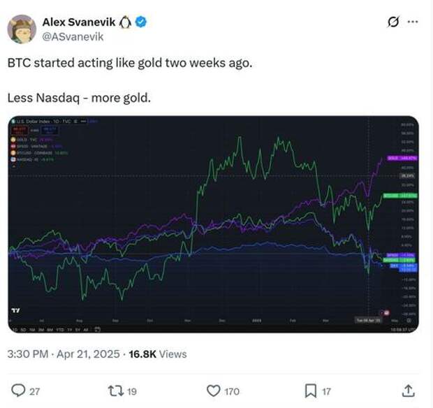 On April 22, Alex Svanevik, co-founder and CEO of the Nansen crypto intelligence platform, said Bitcoin’s price is showcasing its growing maturity as a global asset, becoming “less Nasdaq — more gold.”