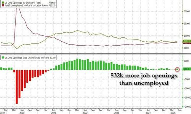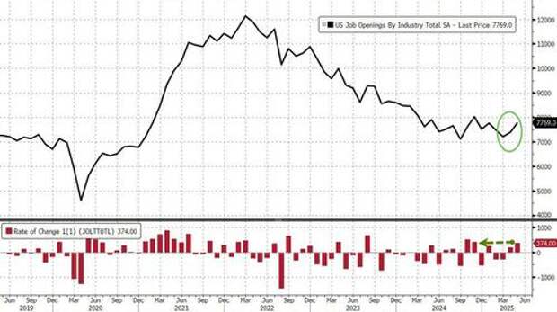 One month after the BLS reported that in April the labor market rebounded, as the number of job openings rose sharply by 191K to 7.4 million, and far above estimates of a 7.1 million print, moments ago we got another indication that the labor market is staging a remarkable rebound when the BLS reported that in May the number of job openings soared by 374K to 7.769 million, the highest since Nov 2024 and smashing estimates of a drop to 7.3 million (from an upward revised 7.395 million print).