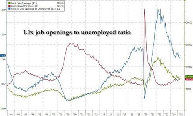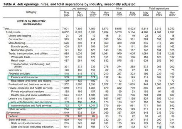 ... but the highlight is that after a mysterious spike last month which prompted us to muse if DOGE had achieved anything at all, we got a resounding answer today when the BLS confirmed that last month's jump was an outlier and the number of Federal government job openings tumbled by almost a third, from 128K to just 89K, the lowest since covid.