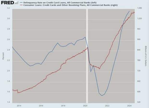 The market function of the yield curve is to allocate credit to its most valued ends. All else equal, higher rates should discourage borrowing and encourage savings. In this cycle, however, that is absolutely not happening. As household income has become squeezed, credit card debt has risen dramatically while delinquent payments are starting to rise also.