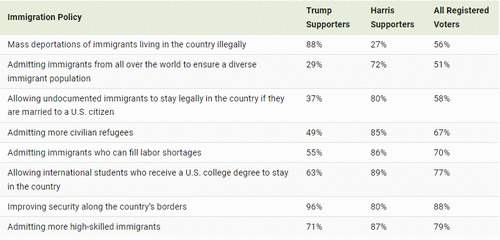 Currently, 88% of Trump supporters agree with mass deportations of unauthorized immigrants compared to just 27% of Harris supporters.
