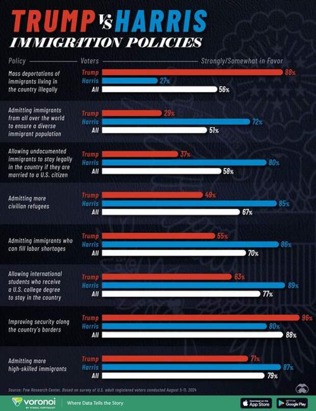 Below, we show the share of registered U.S. voters that are strongly in favor or somewhat in favor of each immigration policy, based on a survey conducted August 5-11, 2024: