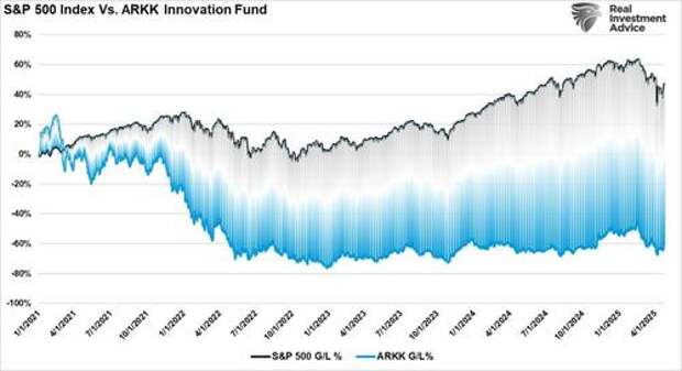 A good example was in 2022, when retail investors chasing meme stocks, SPACs, and IPOs suffered significantly heavier losses than the index. At that time, the ARK Innovation Fund, managed by Cathy Wood, was an example of peak speculation in the market. However, since then, those investments failed to recover. In other words, speculative risk-taking did not lead to outsized returns.