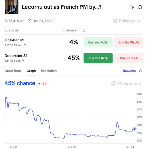 The latest data from the cryptocurrency-based prediction market Polymarket shows that Lecornu's odds of being ousted are 4% between now and the end of October, but rise to 45% by year-end.