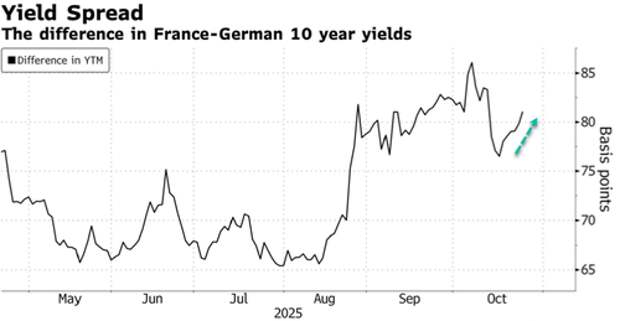 On Friday, France's 10-year yield premium over Germany widened to 81 basis points, the highest in 10 days, according to Bloomberg data. This remains below the 89-basis-point peak during Lecornu's resignation. This indicates that markets priced in greater uncertainty ahead of next week.